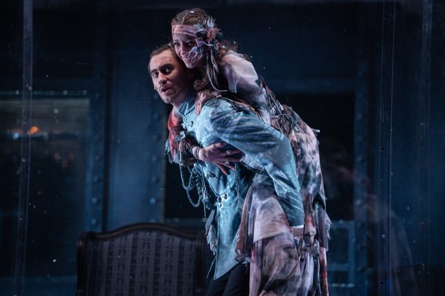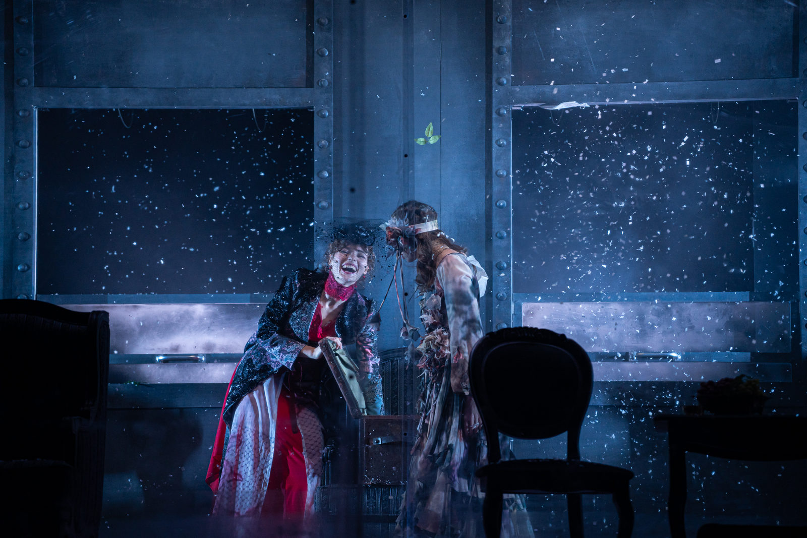 Пространство ВИП-вагона, где происходит всё дальнейшее действие, – мистическое и театральное одновременно. Внутри — вполне домашняя мебель, а ряды чемоданов аккуратно уложены над крышею. Прозрачная стена, обращенная к залу, уподобляет героев бьющимся в инсектарии бабочек или участников реалити-шоу «За стеклом», где кипят постыдные и нелепые страсти. Два огромных промышленных вентилятора на заднем плане изображают крутящиеся колеса паравоза, а заодно пытаются разогнать духоту, что сводит Анну с ума. Ей всё время не хватает воздуха, и это ключевая метафора спектакля: в браке Карениных одной вечно душно, а другому — дует.