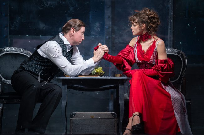 Образы героев нарочито гротескны и далеки от хрестоматийных. В спектакле два состава, и, скорее всего, звучат они по-разному, но в обоих благородство не валялось: Анна здесь – не трагическая аристократка, а вульгарная простушка, даром что богата: в платье ар-деко с оголенными плечами, алыми перчатками и вызывающим красным корсетом. Подобный корсет, тоже красный, носит под мундиром и Вронский, похотливый ловелас, легко меняющий невесту-хиппи на новую интрижку. Сама Китти сгоряча швыряет в окно письма Левина, которого в спектакле нет. Что до Каренина, он редкий душнила, неспроста его играют актеры, специализирующиеся на неприятных типах. Муж («Противно смотреть») мерзко чавкает за едой, не желает покупать круассаны, предлагая Анне взамен яйцо, и ором требует от нее соблюдать приличия. Последнее действующее лицо, не считая тихого болезненного Сережу, которого действительно жалко, — графиня Лидия Ивановна (Анастасия Светлова