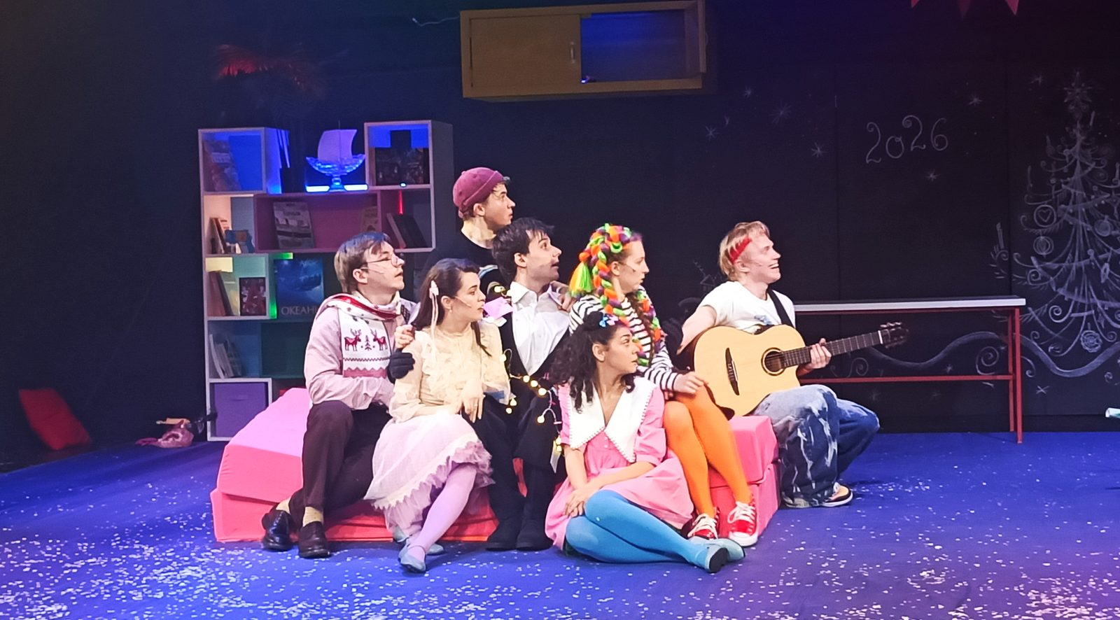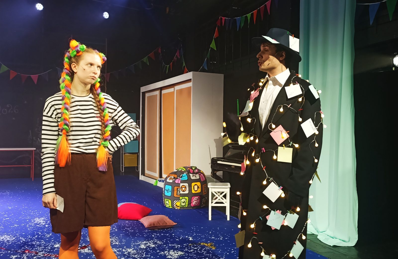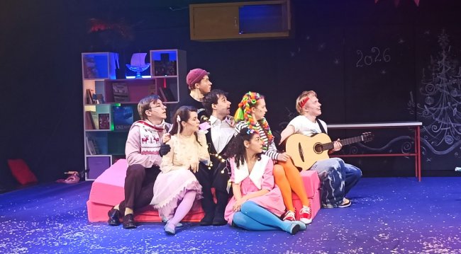 Два динамичных действия по 40 минут — идеальный для целевой аудитории формат: немного музыки, хореографии, зеркальный шар, плюс совсем чуть-чуть сценического дыма и бумажного снега (куда ж без него). Антракт остроумно вписан в пьесу: курьер доставил пиццу, и герои, пригласив зрителей последовать их примеру, «ушли подкрепиться». Позже действие возобновляется с той же игровой ноты. Артисты возвращаются на сцену, а дети в зал — и все вместе продолжают общий веселый квест. Первым делом нужно, конечно, привести себя в порядок после бурных приключений: пришить Алёне откушенный палец, а параллельно выяснить, кто такой «анестезиолог»...