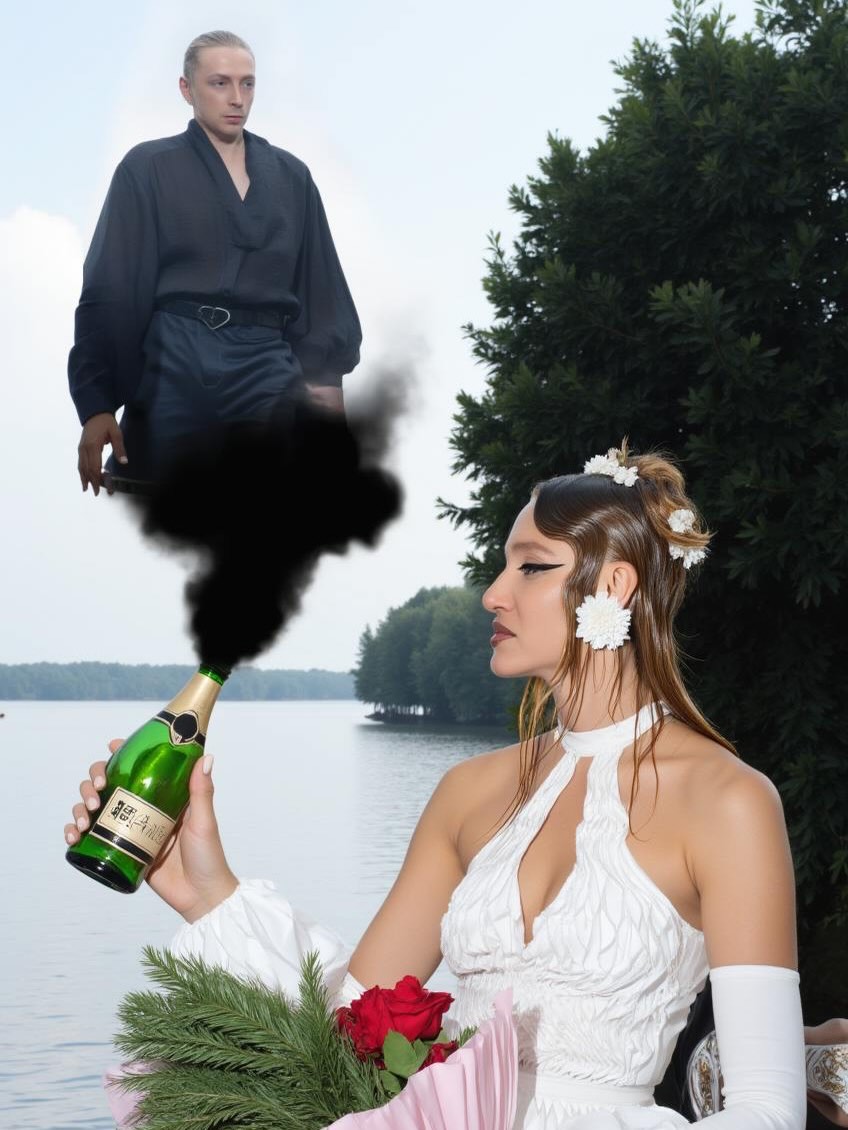 . Темой торжества они выбрали "мир детства": при входе гостей встречали флажки и карта, на которой были отмечены зоны с качелями, батутом, лужайкой для бадминтона, далее шла "батьковская" хата, где раздавались всем желающим пирожки от бабушки и самогон, а также драники от папы. Кроме того, отдельно был обозначен домик воспоминаний — в шалаше на дереве, который Маша построила в детстве.
