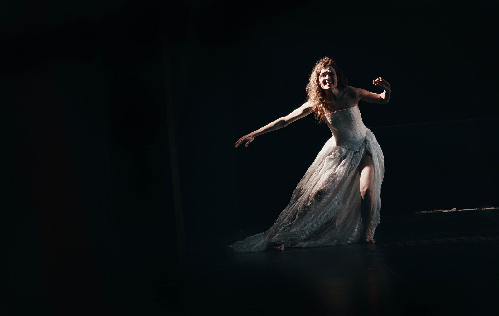 . Растрепанная, в испачканном подвенечном платье, она ходит по сцене и высоким стилем читает стихи Пушкина разных лет – о любви, родине, бесах, свободе. В ее фигуре проступает что-то очень знакомое, надрывное, бутусовское. Впрочем, как иначе, ведь Леонова – ученица Юрия Николаевича.
