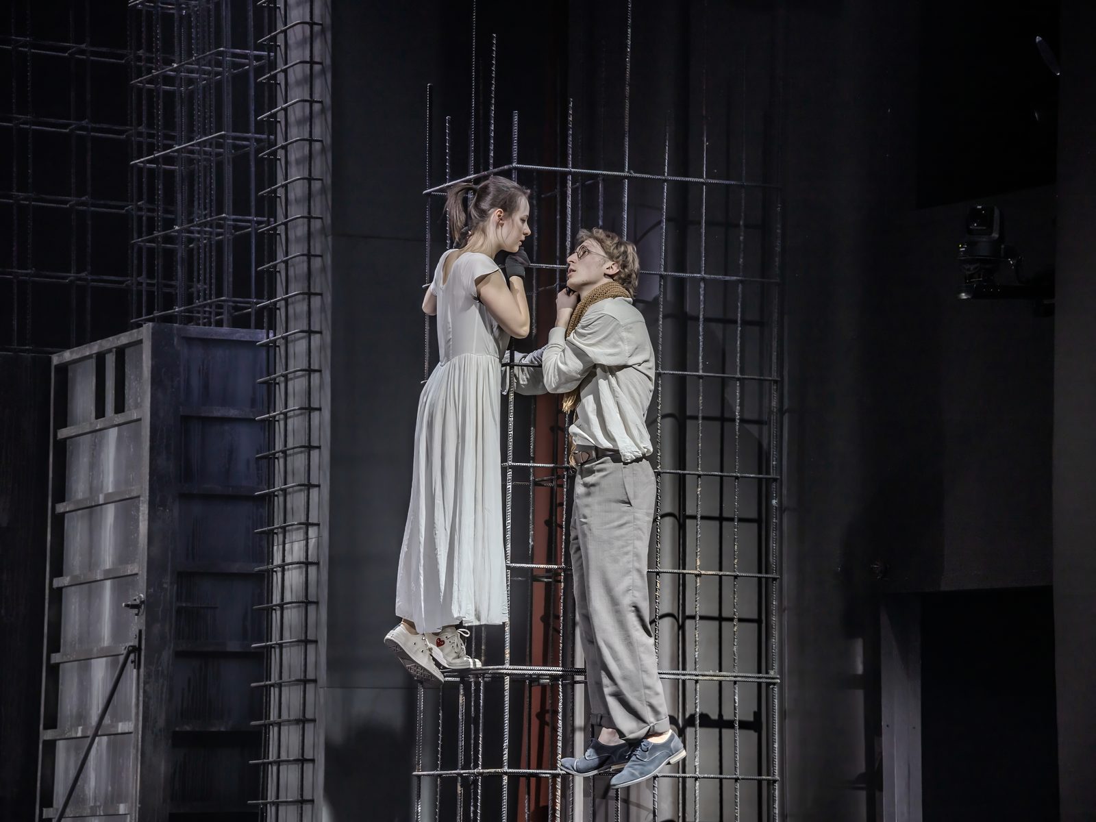 в заглавных ролях) и все та же творческая команда: Максим Обрезков вновь выстраивает схожее пространство, Евгения Панфилова придумывает костюмы, Руслан Майоров работает со светом. Сцена оснащена символическими вертикальными конструкциями-арматурами, а костюмы решены в похожей стилистике, что и в «Капитанской дочке». Так, Ромео появляется в очках, шарфе и шапке-ушанке, Меркуцио и Тибальд – в подтяжках и/или пиджаках на голое тело, герои существуют вне времени и пространства. Такие типажи могли бы встретиться и в американском кино 50-х, и в советские годы, послевоенные, оттепельные, а Джульетта — вылитая Наташа Ростова из афиши того же театра.