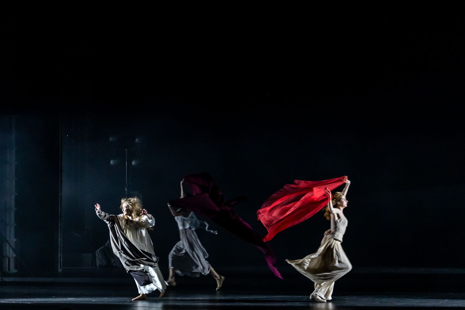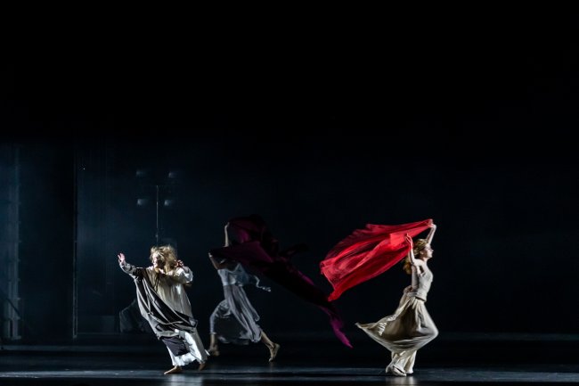 , сложный и интересный свет и многочисленные танцевально-пластические номера: на темном фоне девушки в белом кружатся, танцуют, жонглируют саблями, изображая то буран, то бал, то толпу бунтовщиков, то стадо гусей. В этом визуальном балагане присутствует одна фигура, сшивающая полотно спектакля, — античная Муза или Терпсихора в исполнении Евгении Леоновой