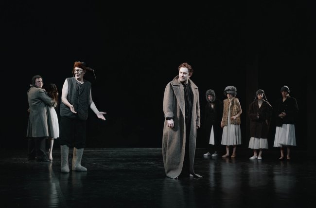 Главное свойство обеих постановок — их несомненное, до смешения, сходство со спектаклями Юрия Бутусова, причем не только по части черноты фона и ритма, а вплоть до деталей одежды, цветового наполнения сцены, музыкальных инструментов в руках героев. Имеется даже шинель вместо заячьего тулупа у Пугачева — прямая цитата из бутусовского «Бега». Всполохи красного: ткани на заднем плане в «Ромео и Джульетты», а в «Капитанской дочке» у Маши Мироновой красная труба в руках — привет Тимофею Трибунцеву