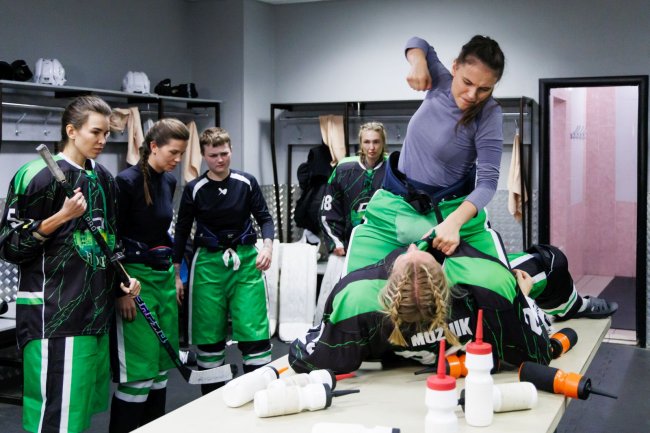 ) принимает нестандартные решения и даже привлекает в команду девушку-вратаря Сашу Сокол (Алина Большакова