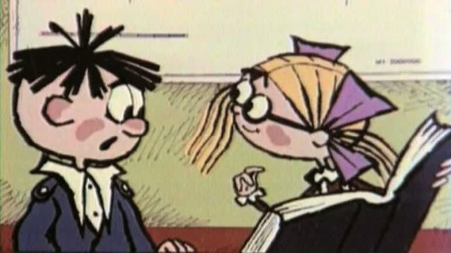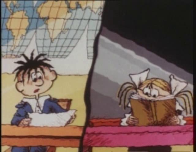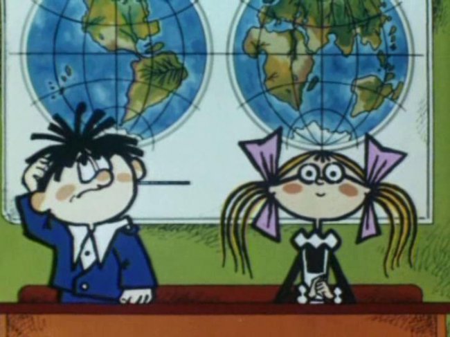 Рисованный мультфильм На задней парте — работа режиссера Валерия Угарова. Оля Знайкина — отличница, а Боря Лейкин — двоечник, но сидят они вместе на задней парте. Оля получает отличную оценку за контрольную по математике, а Боря — двойку. Девочка показывает Лейкину язык, а тот в отместку исправляет ее фамилию на Зазнайкину. Подумав, Оля делает из Лейкина Бармалейкина. Оля и Боря рисуют карикатуры друг на друга, и те оживают в их тетрадках...