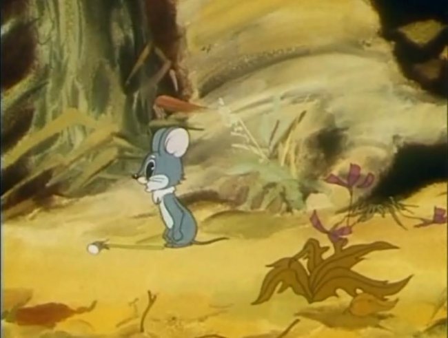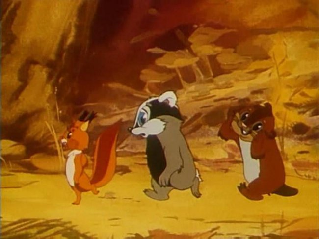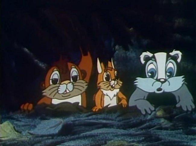 Бельчонок примчался к барсучку с воплем: «Он попался! Зайка! Медведь его повёл в берлогу! Будем выручать!» Барсучок испугался медведя, но всё-таки пошёл. Пришли они к бобру и позвали его идти с ними. А бобёр спросил: «А может он сам виноват?» После долгого спора и бобёр пошёл тоже. Затем за ними пытался увязаться мышонок, но его не взяли. Друзья долго шли по лесу, подкрались к берлоге и, наконец, влезли в окно. Оказалось, что медведь позвал зайку в гости на чаепитие. И тут из печной трубы выскочил мышонок, весь в саже, с криком: «Не подходи!» Все расхохотались и медведь позвал всех пить чай.