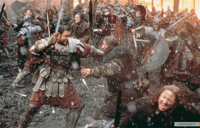 Рана на правой щеке Рассела Кроу, полученная во время первой батальной сцены, абсолютно настоящая. Конь актера чего-то испугался и понесся на деревья, одна из веток проткнула щеку главного героя.