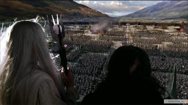 Кадр, где камера удаляется от тысяч орков и урукхаев, во многом напоминает схожий кадр в «Триумфе воли» (1935).